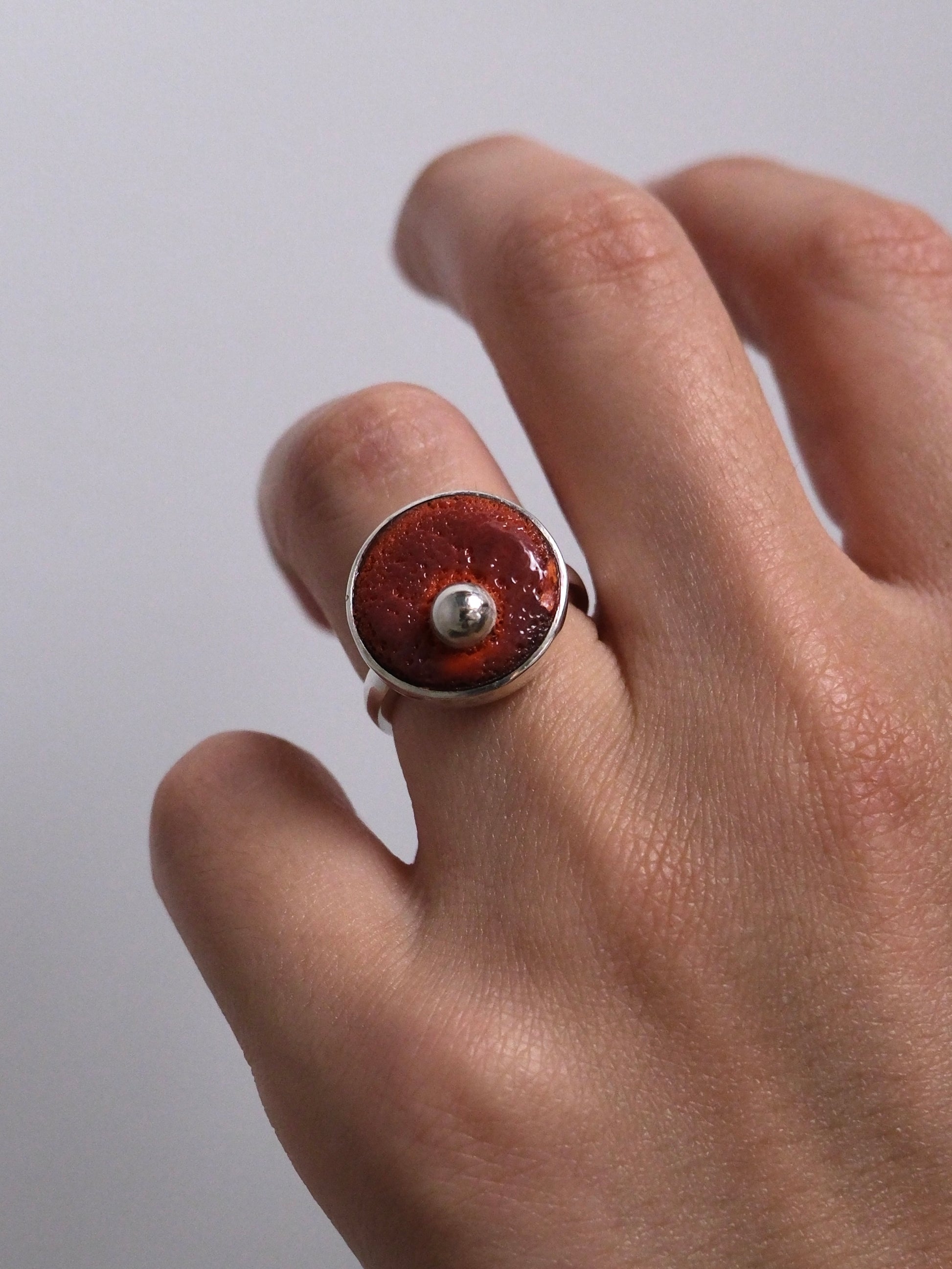 Every enamel surface develops its own fiery textures during firing, making each ring a singular creation.